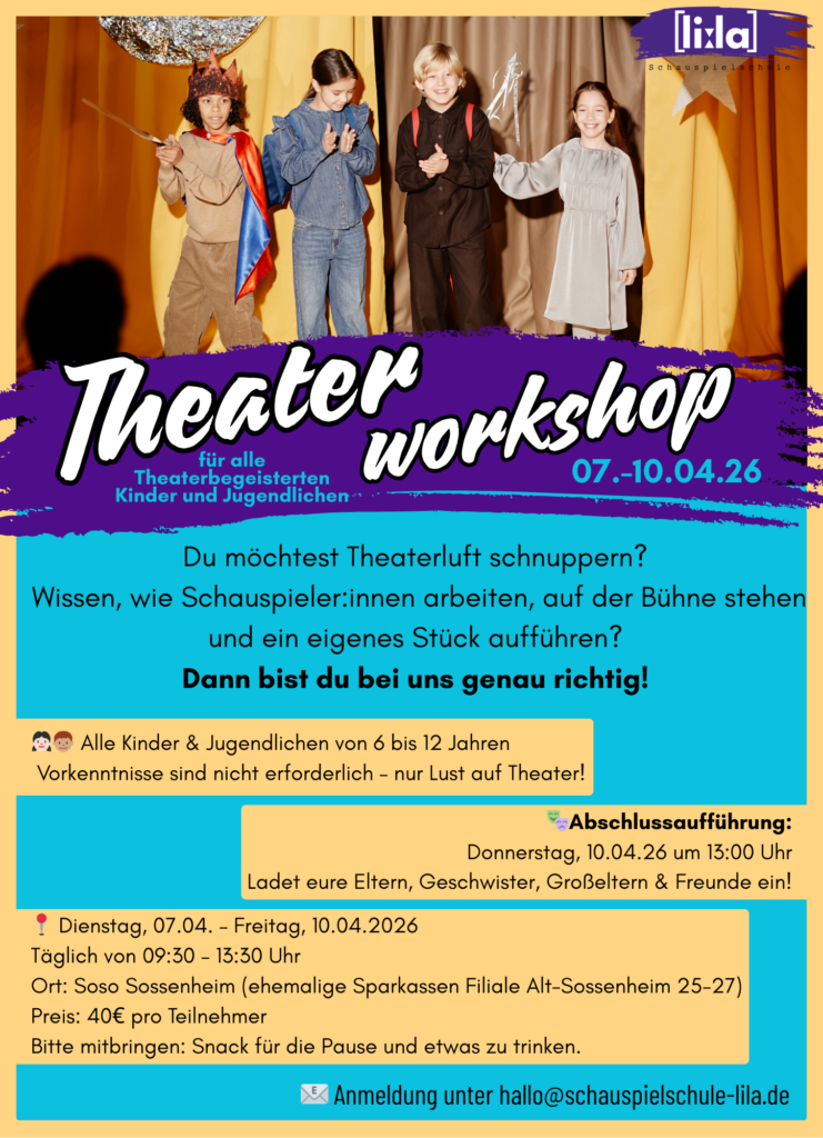 Du möchtest Theaterluft schnuppern? Wissen wie ein Schauspieler arbeitet? Auf der Bühne stehen und ein Stück aufführen? Dann ist dies der richtige Workshop für dich!